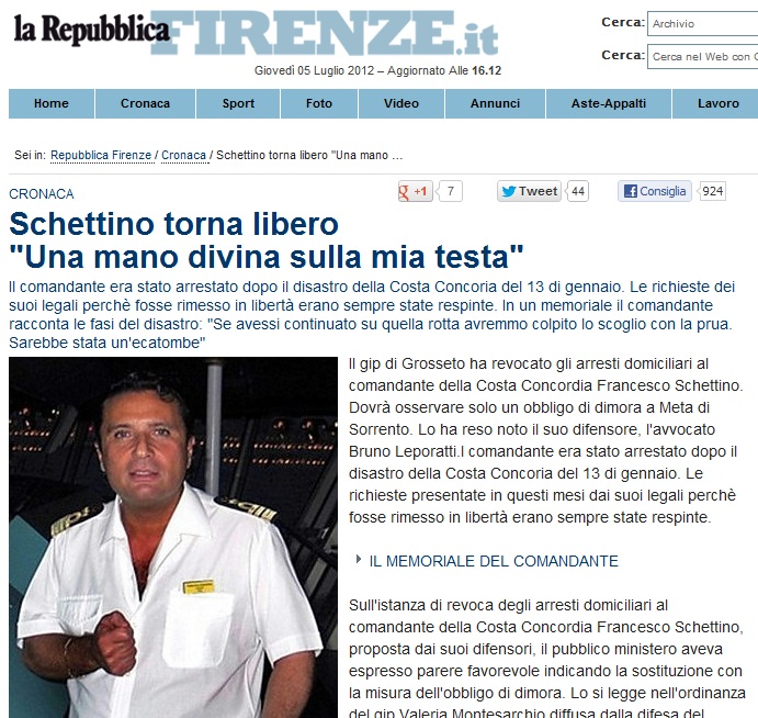 Ο Φραντσέσκο Σκετίνο, καπετάνιος του κρουαζιερόπλοιου Costa Concoria που ναυάγησε στις 13 Ιανουαρίου κοντά στο νησί Τζίλιο, προκαλώντας το θάνατο 32 επιβατών αφέθηκε σήμερα ελεύθερος!