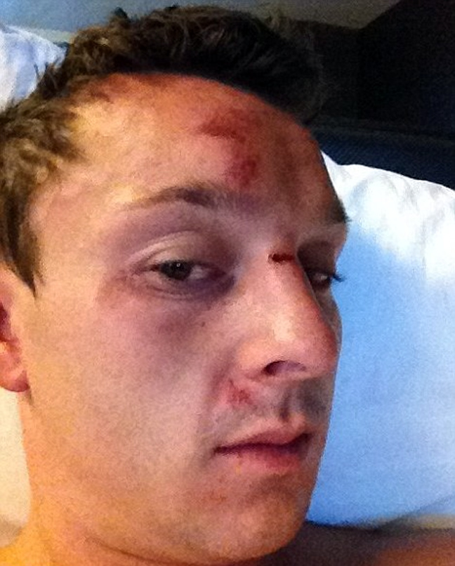 «Περνούσαμε τέλεια μέρα μέχρι που έξι άνδρες μου έκαναν αυτό. Δεν θα μπορούσα να είμαι πιο θυμωμένος», έγραψε στο Twitter ανεβάζοντας και φωτογραφία με το «σημαδεμένο» του πρόσωπο. «Αυτό σου συμβαίνει όταν έχεις επιτυχία;