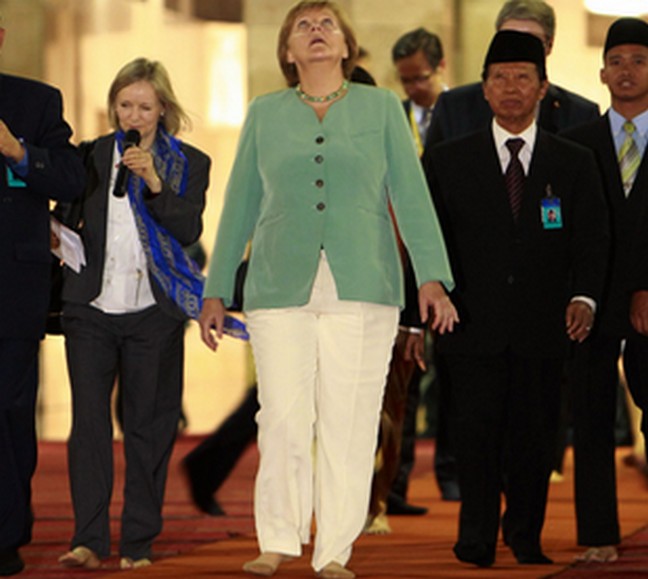 Μαζί με τον πρόεδρο της χώρας Susilo Bambang Yudhoyono επισκέφθηκαν ένα τζαμί και η κ. Μέρκελ, ξυπόλητη εισήλθε στο χώρο θρησκευτικής λατρείας και εντυπωσιάστηκε από τον θόλο του κτιρίου.