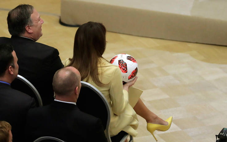 Ο Πούτιν χάρισε στον Τραμπ την επίσημη μπάλα του Μουντιάλ, με τον αμερικανό πρόεδρο να την κρατά για λίγο και να την πετά στη συνέχεια στη σύζυγό του Μελάνια, που καθόταν μπροστά τους. Όπως είπε, θα τη δώσει στον γιο τους.