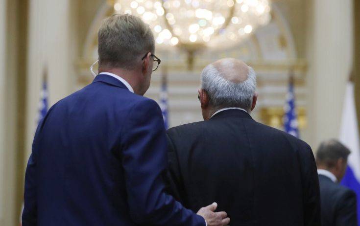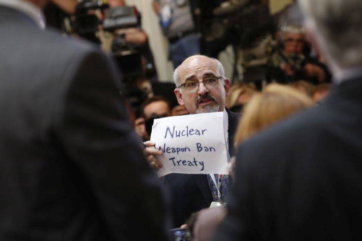 Λίγα λεπτά πριν μπουν στην αίθουσα ο Βλαντιμίρ Πούτιν και ο Ντόναλντ Τραμπ, ένας διαδηλωτής ύψωσε ένα πανό που έγραφε «Συνθήκη για την απαγόρευση των πυρηνικών».