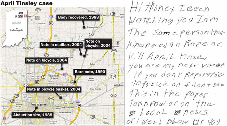 Φως σε ένα ειδεχθές έγκλημα που έγινε πριν από τριάντα χρόνια έριξε πρόσφατα η αστυνομία της Ιντιάνα. Ήταν Πρωταπριλιά του 1988 όταν η 8χρονη Έιπριλ Τίνσλεϊ, από το Φορτ Γουέιν της Ιντιάνα, απήχθη πηγαίνοντας σε φιλικό σπίτι. Τρία 24ωρα αργότερα το άψυχο σώμα της βρέθηκε σε ένα χαντάκι 32 χιλιόμετρα μακριά από τη γειτονιά της. Είχε κακοποιηθεί και στραγγαλιστεί. Η αστυνομία τότε δεν κατάφερε να ταυτοποιήσει το δείγμα DNA που εντόπισε στο εσώρουχο του θύματος και έτσι ο δολοφόνος συνέχισε να κυκλοφορεί ελεύθερος. Σύμφωνα με το FBI, δύο χρόνια μετά, στον τοίχο ενός αχυρώνα, κοντά στο χαντάκι όπου είχε εντοπιστεί νεκρή η 8χρονη, βρέθηκε ένα μήνυμα γραμμένο με κραγιόν το οποίο έλεγε «σκότωσα την 8χρονη Έπριλ Μαρί Τίσλεϊ, θα σκοτώσω ξανά».