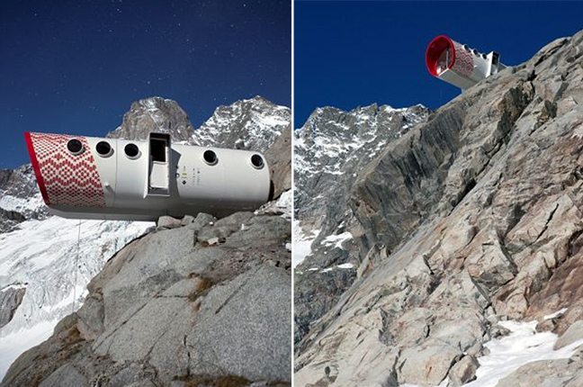 Ο μεταλλικός άσπρος και κόκκινος κύλινδρος μπορεί να φιλοξενήσει έως δώδεκα ορειβάτες που δοκιμάζουν τις αντοχές τους στο Mont Blanc στην Ιταλία.