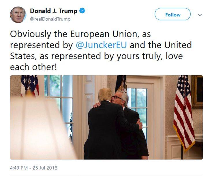 Ο Αμερικανός πρόεδρος είχε συνοδεύσει τη φωτογραφία με το εξής σχόλιο: «ξεκάθαρα, η Ευρωπαϊκή Ένωση, την οποία εκπροσωπούσε ο @JunckerEU και οι ΗΠΑ, που εκπροσωπούσα εγώ, αγαπιούνται!».