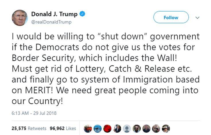 «Είμαι πρόθυμος να επιτρέψω την “παύση λειτουργίας” της κυβέρνησης, στην περίπτωση που οι Δημοκρατικοί δεν μας δώσουν τις απαραίτητες ψήφους για τη Συνοριακή Ασφάλεια, η οποία συμπεριλαμβάνει και το Τείχος! Πρέπει να ξεφορτωθούμε την Λοταρία και τελικά να πάμε σ’ ένα σύστημα μετανάστευσης που θα βασίζεται στις ΑΞΙΕΣ! Χρειαζόμαστε τους καλύτερους ανθρώπους να έρχονται στη Χώρα μας!» έγραψε χαρακτηριστικά ο πρόεδρος Τραμπ στο Twitter.