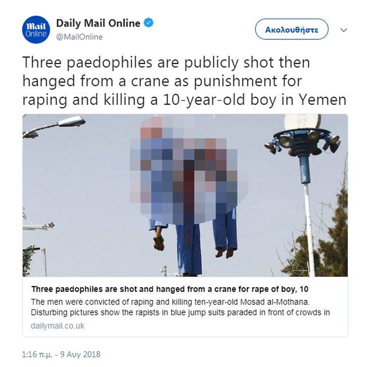 Τρεις παιδόφιλοι τουφεκίστηκαν και κρεμάστηκαν δημοσίως στην Υεμένη