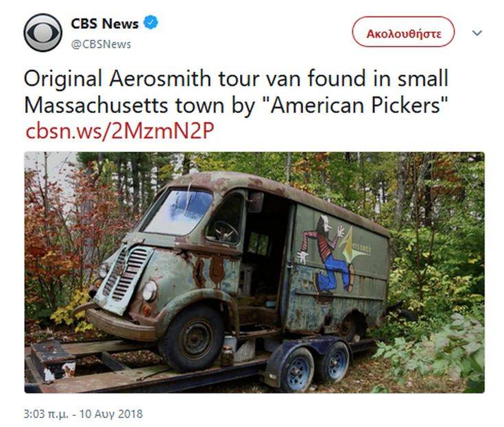 Ένα εγκαταλελειμμένο βαν που χρησιμοποιούσαν οι θρύλοι της ροκ Aerosmith βρέθηκε κατά τη διάρκεια γυρισμάτων αμερικανικού τηλεοπτικού προγράμματος για αντίκες, «American Pickers». Οι παρουσιαστές και συλλέκτες Φρανκ Φριτζ και Μάικ Γουλφ σκόνταψαν στο American Harvester Metro βαν του 1964 στο πρόσφατο επεισόδιο του τηλεοπτικού reality, στο History Channel. Σύμφωνα με δημοσίευμα στο Boston.com, το πρώην μέλος των Aerosmith, Ρέι Ταμπάνο επιβεβαίωσε ότι το βαν ήταν του συγκροτήματος. Το σκουριασμένο όχημα βρέθηκε πίσω από ένα αγρόκτημα στο Τσέστερφιλντ της Μασαχουσέτης. Η πόλη απέχει περίπου 160 χιλιόμετρα από την έδρα των Aerosmith, τη Βοστόνη.