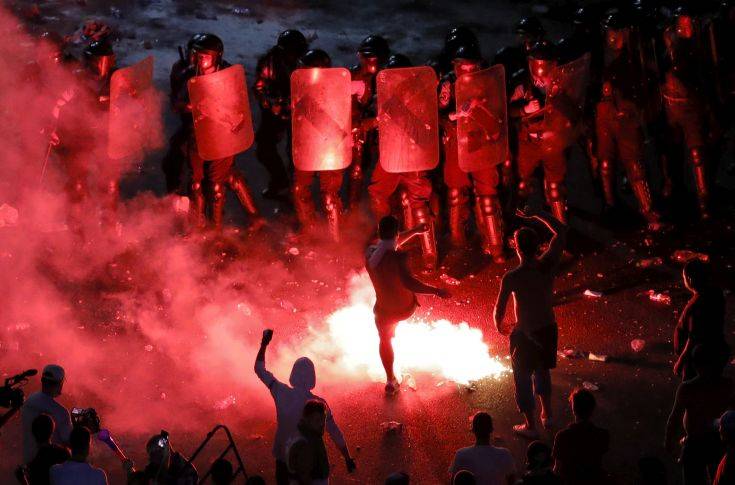 Όταν διαδηλωτές αποπειράθηκαν να διασπάσουν τις γραμμές τους μπροστά στην έδρα της κυβέρνησης, περίπου χίλιοι χωροφύλακες και μέλη των μονάδων αντιμετώπισης ταραχών επενέβησαν για να εκκενωθεί η Πλατεία της Νίκης και ξέσπασαν γενικευμένα επεισόδια τα οποία, σύμφωνα με τη χωροφυλακή, προκάλεσαν «μέλη συλλόγων οπαδών ποδοσφαιρικών ομάδων» και «προβοκάτορες».