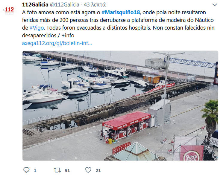 Δεν υπάρχουν πληροφορίες για νεκρούς από το περιστατικό αυτό που έγινε κατά το φεστιβάλ O Marisquino στο Βίγο, στην περιοχή της Γαλικίας, συμπλήρωσε το δίκτυο Radio Galega.