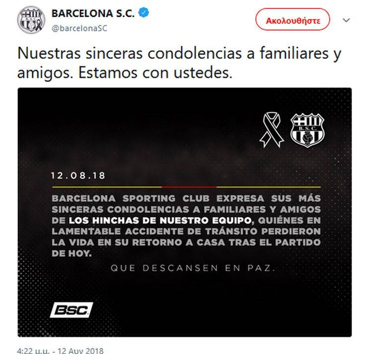Θρήνος στο Εκουαδόρ με 12 οπαδούς της Μπαρτσελόνα Γκουαγιακίλ να χάνουν τη ζωή τους σε τροχαίο που είχαν με το λεωφορείο που τους μετέφερε μετά το παιχνίδι με Ντεπορτίβο Κουένκα. Η τραγωδία σημειώθηκε όταν κάτω από αδιευκρίνιστες αιτίες το λεωφορείο που μετέφερε τους οπαδούς της Μπαρτσελόνα βγήκε από την πορεία του και αναποδογύρισε. Το τροχαίο είχε ως συνέπεια τον τραγικό απολογισμό των 12 νεκρών οπαδών της ομάδας, ενώ άλλοι 30 μεταφέρθηκαν τραυματίες στο νοσοκομείο. Το ποδόσφαιρο της χώρας βυθίστηκε σε πένθος, ενώ ανακοίνωση έβγαλε και ο σύλλογος της Μπαρτσελόνα Γκουαγιακίλ, ο οποίος εξέφρασε τα συλλυπητήρια στις οικογένειες των θυμάτων.