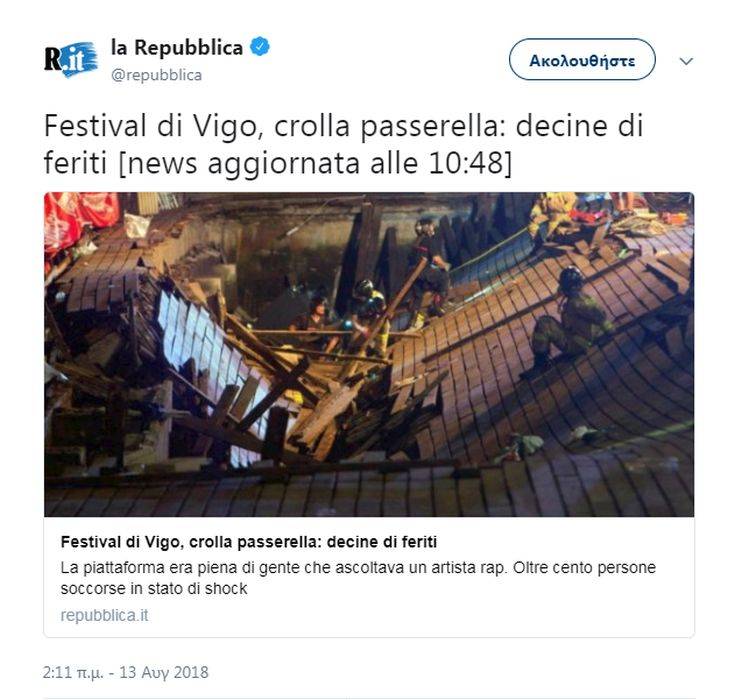 Περισσότεροι από 300 άνθρωποι τραυματίστηκαν, εκ των οποίων οι 9 σοβαρά, από την κατάρρευση χθες το βράδυ μιας ξύλινης εξέδρας σε φεστιβάλ μουσικής που γινόταν σε παραλία του Βίγο, στη βορειοδυτική Ισπανία, ανακοίνωσαν πριν από λίγο οι τοπικές αρχές. «Συνολικά 316 άνθρωποι τραυματίστηκαν», ανακοίνωσε η περιφερειακή κυβέρνηση της Γαλικίας, της περιοχής στην οποία βρίσκεται το Βίγο. «Μεταξύ αυτών, έχουμε αυτή τη στιγμή 9 που νοσηλεύονται. Δεν κινδυνεύει η ζωή τους, αλλά φέρουν σοβαρά τραύματα», διευκρίνισε ο Χεσούς Βάθκεθ Αλμουίνια, επιφορτισμένος με θύματα υγείας στους κόλπους της περιφερειακής κυβέρνησης, διευκρινίζοντας ότι οι δύο από τους τραυματίες είναι ανήλικοι. Οι περισσότεροι άλλοι έχουν τραυματιστεί ελαφρά, σημείωσε, όπως αναφέρει το Αθηναϊκό Πρακτορείο Ειδήσεων. Πάνω στην ξύλινη εξέδρα μήκους 30 μέτρων και πλάτους 10, η οποία βρισκόταν μέσα στο νερό, σε παραλία του Βίγο, βρίσκονταν πάρα πολλοί θεατές που παρακολουθούσαν μια συναυλία ραπ στο πλαίσιο του φεστιβάλ O Marisquiño, δήλωσε ο δήμαρχος του Βίγο Άμπελ Καμπαγέρο, διευκρινίζοντας ότι αυτή κατέρρευσε ακριβώς πριν από τα μεσάνυχτα.