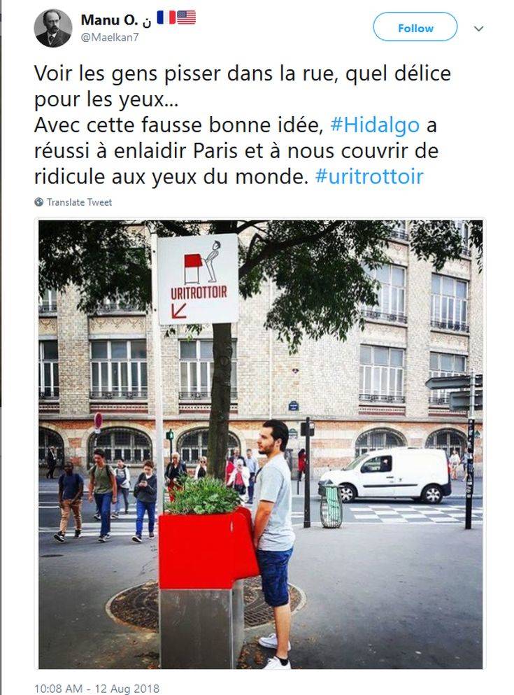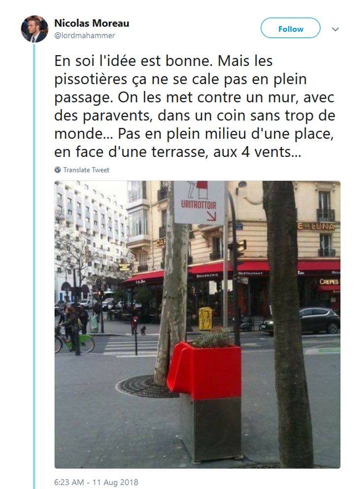 Το ένα από τα κατακόκκινα «Ουριτροτουάρ» που τοποθετήθηκε στο Ιλ Σεν-Λουί, κοντά στον Καθεδρικό της Παναγίας των Παρισίων, με «θέα» στα τουριστικά πλοιάρια που διαπλέουν τον Σηκουάνα προκάλεσε ιδιαίτερη οργή. Κάτοικοι της περιοχής με επιστολή τους στον δήμο ζητούν την απομάκρυνση της τουαλέτας και προαναγγέλουν ότι θα συλλέξουν υπογραφές ώστε να ασκηθεί πίεση για να ικανοποιηθεί το αίτημά τους.