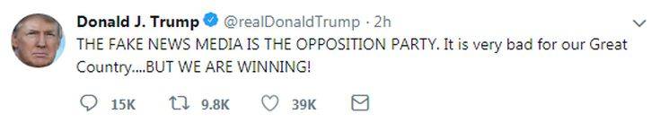 «ΤΑ ΜΜΕ ΤΩΝ ΨΕΥΤΙΚΩΝ ΕΙΔΗΣΕΩΝ ΕΙΝΑΙ ΤΟ ΚΟΜΜΑ ΤΗΣ ΑΝΤΙΠΟΛΙΤΕΥΣΗΣ. Είναι πολύ κακό για τη Μεγάλη μας Χώρα… ΑΛΛΑ ΘΑ ΝΙΚΗΣΟΥΜΕ», έγραψε ο Τραμπ στο Twitter.