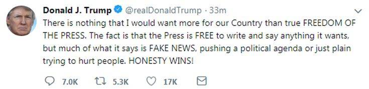 Λίγο αργότερα, ο Τραμπ επανήλθε αναφέροντας: «Δεν υπάρχει τίποτα που θα ήθελα περισσότερο για τη Χώρα μας από την αληθινή ΕΛΕΥΘΕΡΙΑ ΤΟΥ ΤΥΠΟΥ. Το γεγονός είναι ότι ο Τύπος είναι ΕΛΕΥΘΕΡΟΣ να γράφει και να λέει οτιδήποτε θέλει, όμως τα περισσότερα που λέει είναι FAKE NEWS, προωθώντας μία πολιτική ατζέντα ή απλά προσπαθώντας να πληγώσει ανθρώπους. Η ΕΙΛΙΚΡΙΝΕΙΑ ΚΕΡΔΙΖΕΙ!».