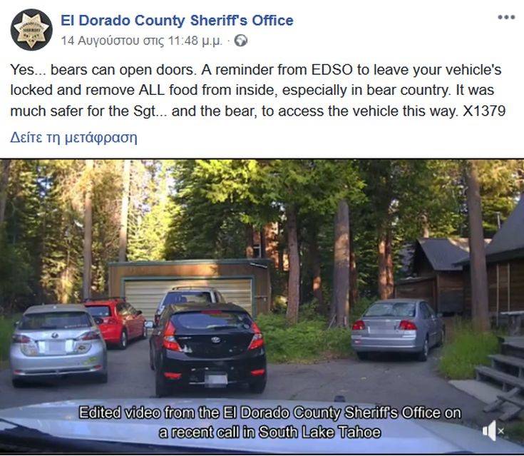 Οι οδηγίες που έχει δώσει ο σερίφης της Κομητείας Ελ Ντοράντο στην Καλιφόρνια, προς τους οδηγούς, είναι σαφείς: να μην αφήνουν τρόφιμα μέσα στο αυτοκίνητο και να κλειδώνουν πάντα τις πόρτες.