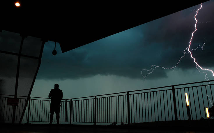 Ένας άνδρας παρακολουθεί τις αστραπές κατά τη διάρκεια μιας έντονης καταιγίδας πριν από ένα παιχνίδι μπέιζμπολ μεταξύ Kansas City Royals και Cleveland Indians στο Κάνσας.