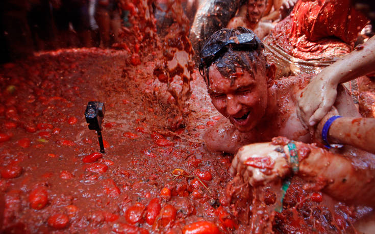 Στην ετήσια μάχη της «Tomatina», στο χωριό Μπουνόλ κοντά στη Βαλένθια, τα φορτηγά έριξαν στους δρόμους της πόλης 160 τόνους τομάτας για τους περίπου 20.000 συμμετέχοντες.