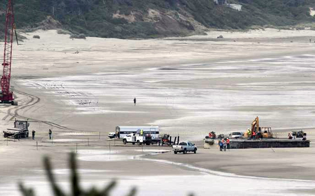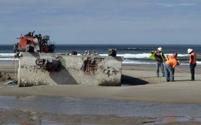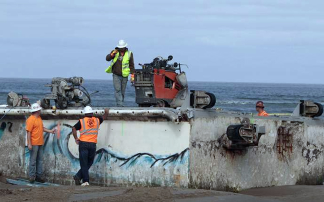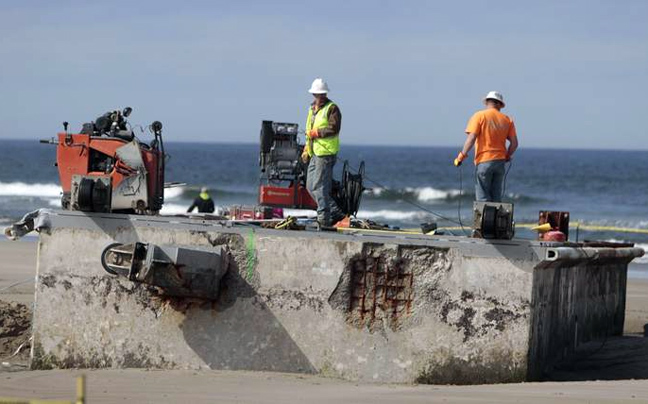 Πιάνουν δουλειά τα συνεργεία στο Όρεγκον για να κόψουν σε κομμάτια ένα μεγάλο κομμάτι τσιμέντο από προβλήτα της Φουκουσίμα που παρασύρθηκε στο τσουνάμι που έπληξε το Μάιο του 2011 την Ιαπωνία και, ταξιδεύοντας στον ωκεανό, έφτασε στις ΗΠΑ.