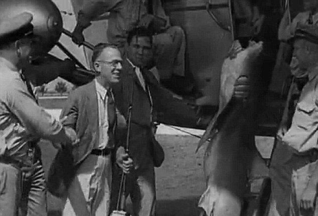 Στο ασπρόμαυρο βίντεο διάρκειας 57 δευτερολέπτων φαίνεται ένας μικρός καρχαρίας να πιάνεται στο αγκίστρι που έχουν ρίξει οι ψαράδες από την καμπίνα ενός αερόπλοιου.