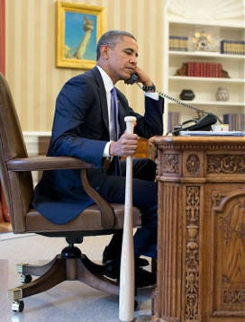 Οι δύο ηγέτες συνομίλησαν την Δευτέρα για την κρίση στη Συρία. Η φωτογραφία του Ομπάμα, που καθόταν στο γραφείο του μιλώντας στο τηλέφωνο κρατώντας ένα ρόπαλο με το αυτόγραφο του μαύρου Αμερικανού διάσημου παίκτη του μπέιζμπολ Χανκ Άαρον, διανεμήθηκε στα ΜΜΕ από το Λευκό Οίκο.