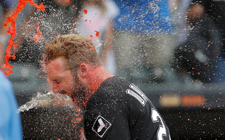Ο Matt Davidson των Chicago White Sox εκστασιασμένος από το χτύπημά του στο παιχνίδι κατά των Detroit Tigers στο Σικάγο.