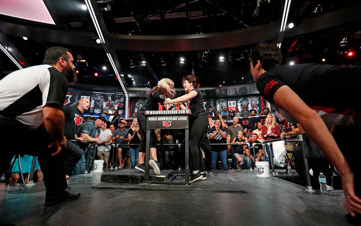 Δύο γυναίκες διαγωνιζόμενες στο παγκόσμιο πρωτάθλημα χειροπάλης (μπρα-ντε-φερ) δίνουν και την τελευταία ικμάδα της δύναμης τους για τη νίκη, μπροστά στα μάτια των διαιτητών και των θεατών.