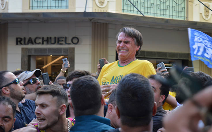 Ο ακροδεξιός υποψήφιος για την προεδρία της Βραζιλίας, Ζαιρ Μπολοσονάριο, σφαδάζει στα χέρια των οπαδών του καθώς μόλις έχει δεχθεί μία μαχαιριά στο στομάχι.