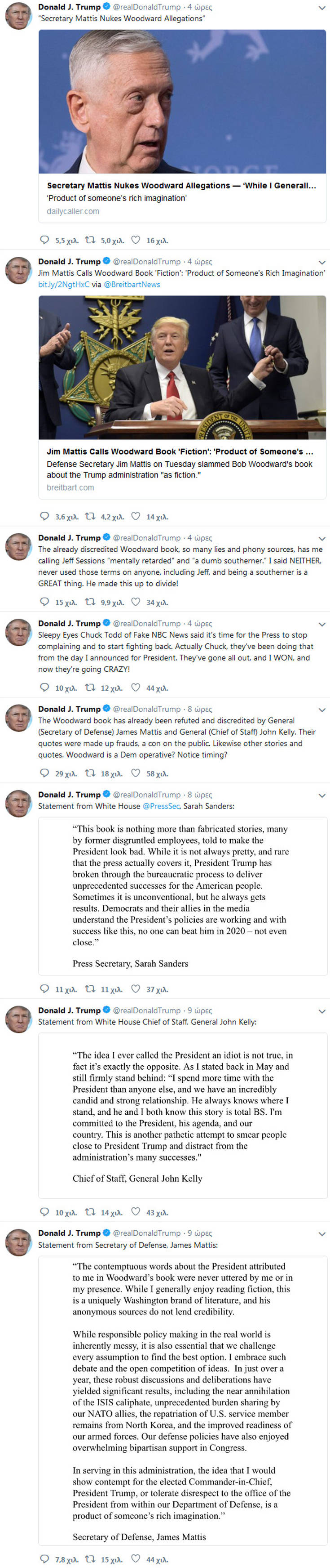 Σε άλλο του tweet αργά χθες το βράδυ ο Τραμπ διέψευσε τους ισχυρισμούς του Γούντγουορντ ότι αποκάλεσε τον πρώην υπουργό Εξωτερικών Ρεξ Τίλερσον «χαζό Νότιο», αλλά και ότι αποκάλεσε τον υπουργό Δικαιοσύνης Τζεφ Σέσιονς «νοητικά καθυστερημένο». «Δεν είπα τίποτα από τα δύο. Δεν έχω χρησιμοποιήσει αυτούς τους χαρακτηρισμούς για κανέναν, περιλαμβανομένου του Τζεφ. Το να είσαι Νότιος είναι καταπληκτικό. Τα κατασκεύασε για να μας διχάσει» τόνισε.