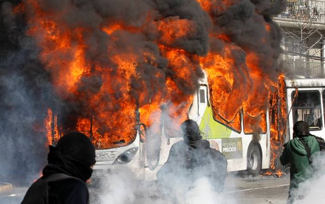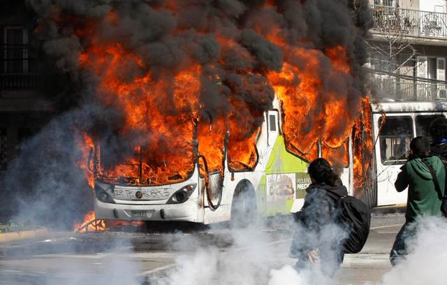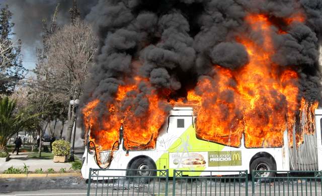 Τρία λεωφορεία της δημόσιας υπηρεσίας συγκοινωνιών τυλίχτηκαν στις φλόγες στο Σαντιάγο της Χιλής κατά τη διάρκεια φοιτητικής διαδήλωσης και των πολύωρων συγκρούσεων που την ακολούθησαν, μεταξύ των νεαρών διαδηλωτών και των δυνάμεων ασφαλείας χθες Τετάρτη, ανακοίνωσαν σήμερα οι αρχές.