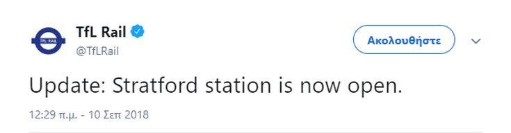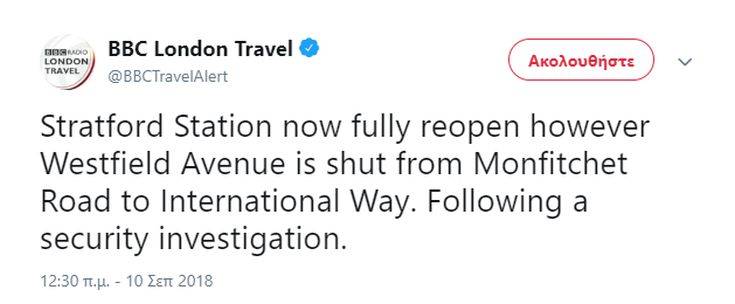 Το περιστατικό με το αυτοκίνητο που εισήλθε στον χώρο στάθμευσης του εμπορικού κέντρου Γουέστφιλντ στο ανατολικό Λονδίνο δεν χαρακτηρίζεται πλέον ύποπτο και έληξε ο συναγερμός που είχε σημάνει νωρίτερα, ανακοίνωσε η αστυνομία και ανέφεραν στο Twitter οι TfL Rail, Jubilee Line και BBC London Travel. Ο σιδηροδρομικός σταθμός του Στράτφορντ έκλεισε νωρίτερα σήμερα εξαιτίας συναγερμού ασφαλείας και η βρετανική αστυνομία μεταφορών εξέτασε ένα περιστατικό με ένα αυτοκίνητο που εισήλθε στο εμπορικό κέντρο, όπως αναφέρει το Αθηναϊκό Πρακτορείο Ειδήσεων.
