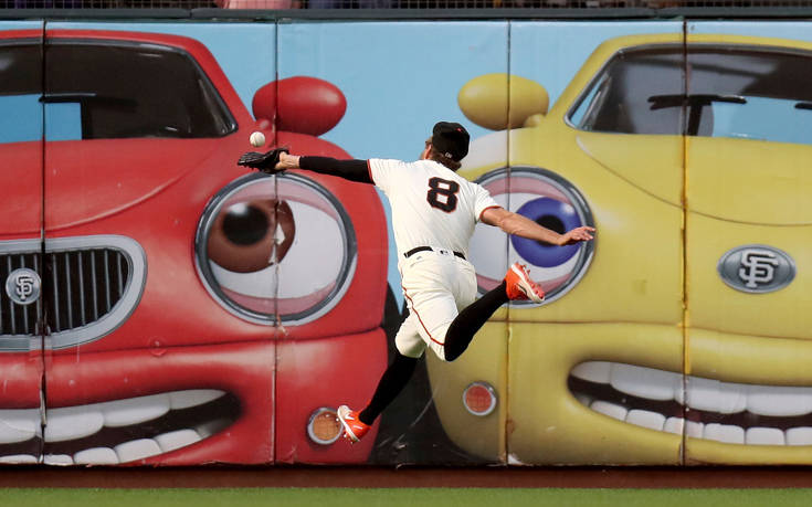 Ο άσος των San Francisco Giants, Hunter Pence, προσπαθεί να πιάσει τη μπάλα κατά τη διάρκεια του παιχνιδιού με τους Atlanta Braves, στο Σαν Φραντσίσκο των ΗΠΑ.