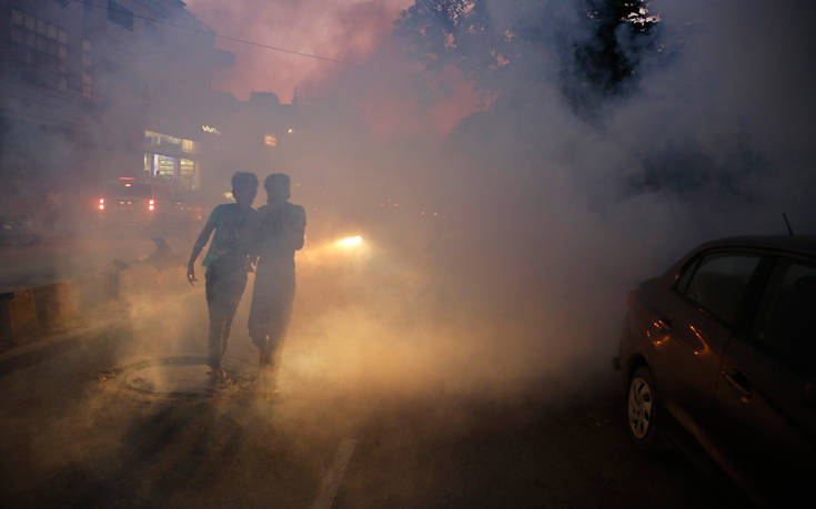 Αγόρια στο Αλαχαμπάντ της Ινδίας περνούν μέσα από καπνό για να αποτρέψουν την εξάπλωση ασθενειών που προκαλούνται από τα κουνούπια.
