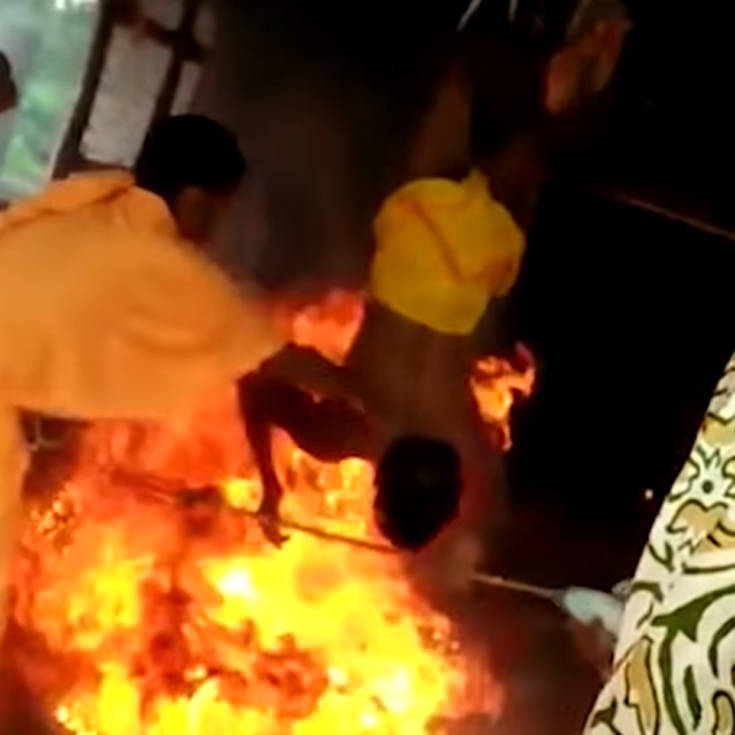 Ακόμα και «εξαγνισμένο βούτυρο» έριξαν στην πυρά, μόνο που οι φλόγες τύλιγαν τώρα το κορμί του. Κάποια στιγμή τον βλέπουμε να πέφτει πάνω στη φωτιά και οι ιερείς τρέχουν να τον σώσουν.