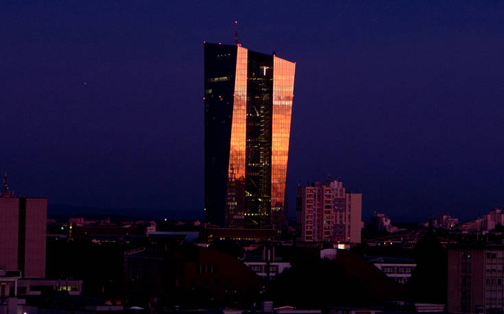 Το κτίριο της Ευρωπαϊκής Κεντρικής Τράπεζας φωτίζεται από το ηλιοβασίλεμα στη Φρανκφούρτη της Γερμανίας.