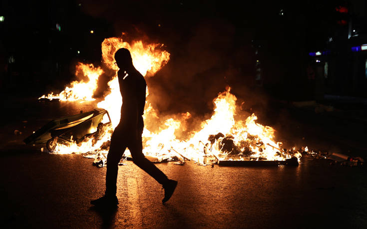 Ένας νεαρός περπατάει μπροστά από φλεγόμενο κάδο απορριμμάτων κατά τη διάρκεια διαδήλωσης στον Πειραιά, για τα πέντε χρόνια από τη δολοφονία του Παύλου Φύσσα.