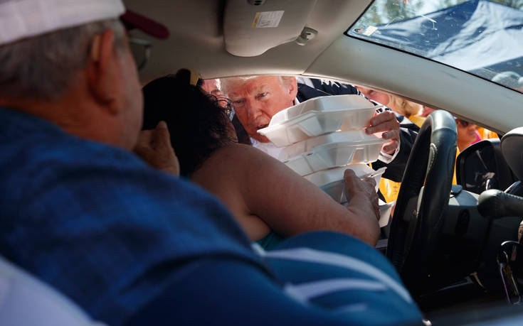 Ο πρόεδρος των ΗΠΑ, Ντόναλντ Τραμπ μοιράζει γεύματα στην εκκλησία Temple Baptist Church σε περιοχή που ο τυφώνας «Florence» σάρωσε τα πάντα στη Βόρεια Καρολίνα.