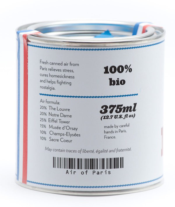 Μάλιστα, κάθε κονσέρβα περιέχει ολόκληρη λίστα από συστατικά. Για παράδειγμα η κονσέρβα του Παρισιού περιέχει μυρωδιές από τη Μονμάρτη, τα Ηλύσια Πεδία, το μουσείο του Λούβρου, την Παναγία των Παρισίων και τον Πύργο του Άιφελ.