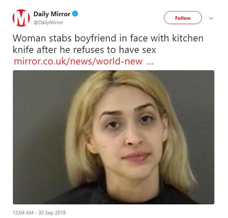 Μια νεαρή γυναίκα από τη Φλόριντα κατηγορείται ότι μαχαίρωσε τον σύντροφό της στο πρόσωπο όταν εκείνος αρνήθηκε να κάνει σεξ μαζί της.