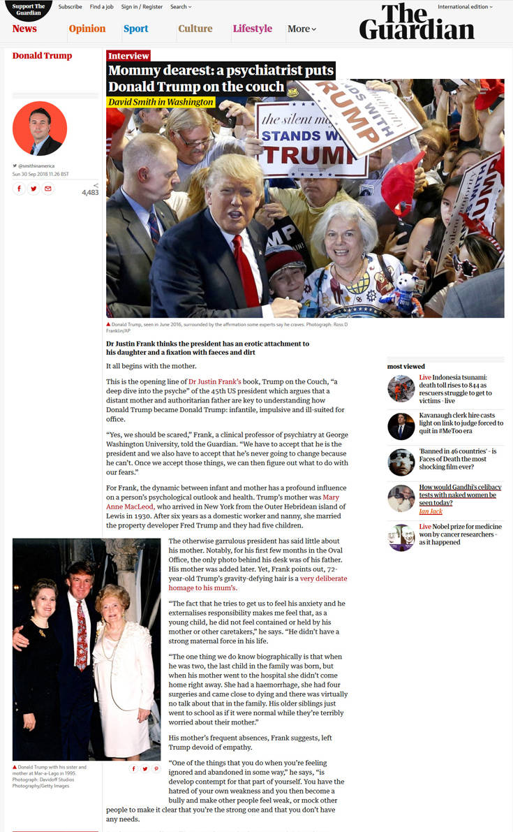 Σύμφωνα με τον Φρανκ, η δυναμική ανάμεσα στο βρέφος και στη μητέρα έχει μια σημαντική επίδραση στο ψυχολογικό προφίλ και την υγεία ενός ανθρώπου. Η μητέρα του Τραμπ, η Μαίρη Αν ΜακΛέοντ, έφθασε στη Νέα Υόρκη από τη νήσο Λιούις που ανήκει στις Εξωτερικές Εβρίδες – νησιωτικό σύμπλεγμα κοντά στις δυτικές ακτές της Σκωτίας- το 1930.