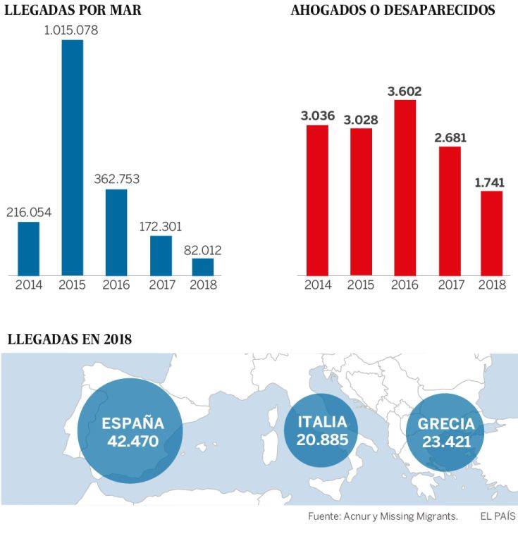 [Το γράφημα δείχνει τις θαλάσσιες αφίξεις (Llegadas por mar), τους πνιγέντες, ή αγνοούμενους (Ahogados o desaparecidos) και τις αφίξεις σε Ισπανία (42.470), Ιταλία (20.885) και Ελλάδα (23.421) και παραχωρείται από το Αθηναϊκό Πρακτορείο].