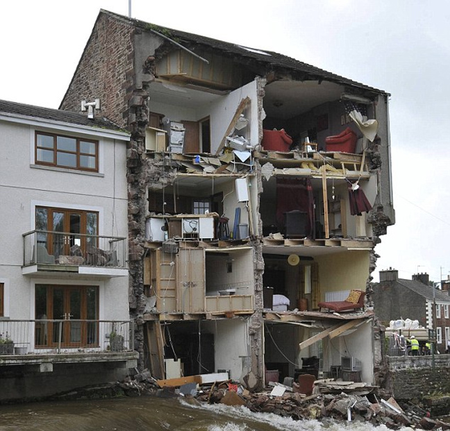 Πρώτα οι γείτονες άκουσαν έναν πολύ δυνατό θόρυβο. Μετά κάτι να πέφτει με δύναμη στο νερό. Κανείς δεν είχε προετοιμαστεί γι’ αυτό που θα αντίκριζε μόλις κοίταξε έξω να δει τι είχε συμβεί: όλο το πίσω μέρος ενός σπιτιού είχε καταρρεύσει μέσα στον πλημμυρισμένο ποταμό Ehen στην Cumbria της Βρετανίας.