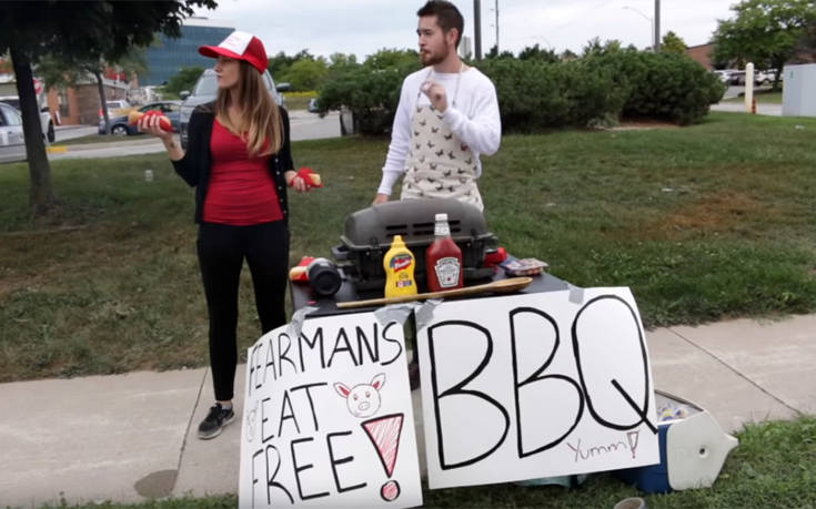 Την ώρα που οι ακτιβιστές προσπαθούν να σταματήσουν τα φορτηγά που μεταφέρουν τα γουρούνια σε σφαγείο του Καναδά, συνειδητοποιούν κάποια στιγμή ότι παραδίπλα κάποιοι ψήνουν χοτ ντογκ και τα προσφέρουν δωρεάν στους περαστικούς. Ακόμα και τους ακτιβιστές κέρασαν λουκανικάκια!