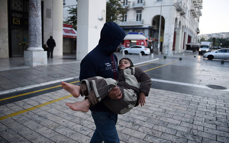 Ένας Κούρδος κρατά στην αγκαλιά του τον γιο του, έξω από αστυνομικό τμήμα στην πλατεία Αριστοτέλους της Θεσσαλονίκης.