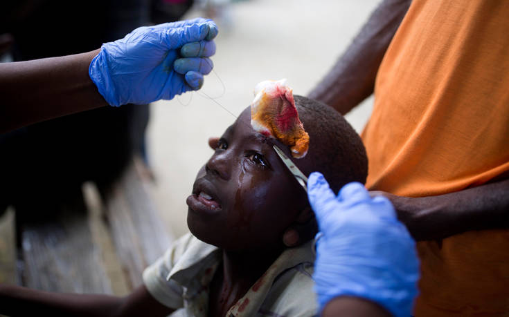 Ένα αγόρι που τραυματίστηκε στο σεισμό δέχεται τις πρώτες βοήθειες στο γενικό νοσοκομείο στο Port-de-Paix της Αϊτής.