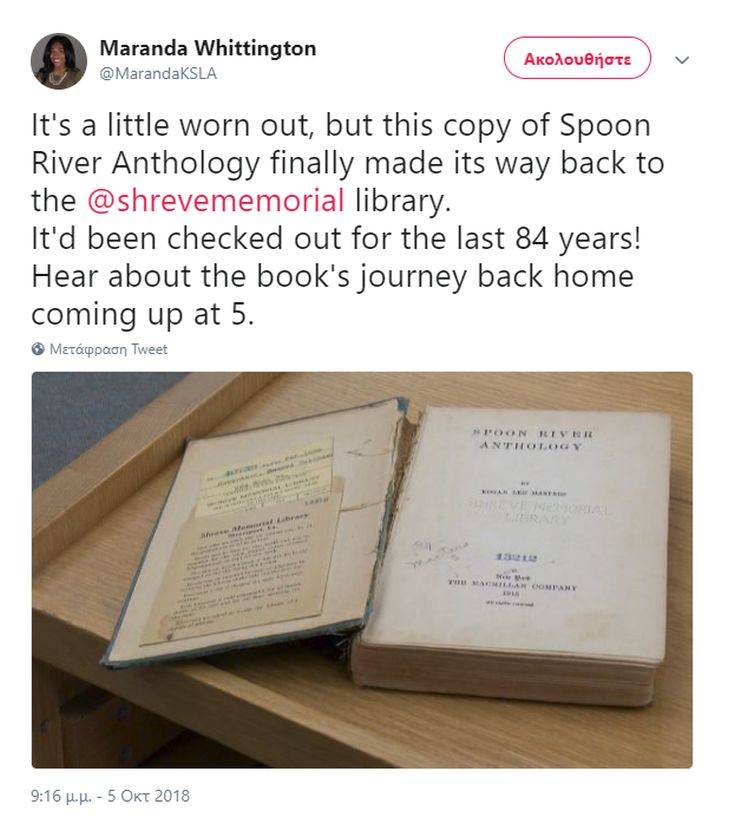 Πριν από 84 χρόνια μια 11χρονη είχε δανειστεί από τη βιβλιοθήκη Shreve Memorial στο Λος Άντζελες το «Spoon River Anthology», ένα βιβλίο ποιημάτων του Edgar Lee Masters που εκδόθηκε το 1915.