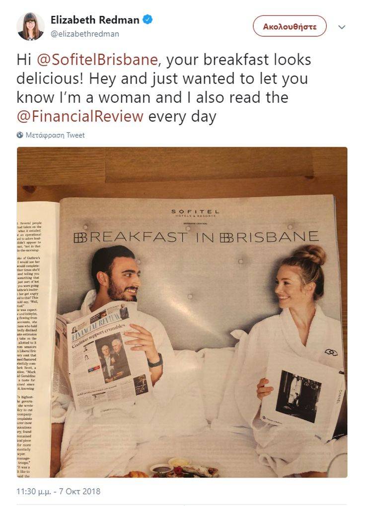 Μια διαφήμιση γνωστού ξενοδοχείου στο Brisbane της Αυστραλίας έγινε θέμα συζήτησης στα μέσα κοινωνικής δικτύωσης με κάποιους χρήστες, μάλιστα, να της κολλούν την ταμπέλα «σεξιστική», υποχρεώνοντας έτσι τους ιθύνοντες να την αποσύρουν άρον άρον.
