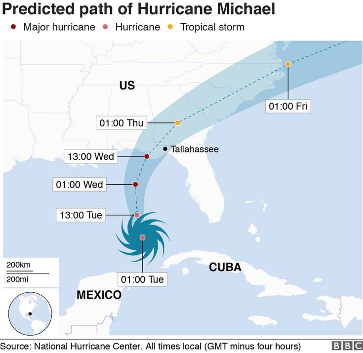 «Ο τυφώνας Μάικλ αναμένεται να ενισχυθεί σε κατηγορία 4, πριν φτάσει στη στεριά» προειδοποιεί το Εθνικό Κέντρο Τυφώνων των ΗΠΑ, σημειώνοντας πως σε κάποιες περιοχές της πολιτείας μπορεί να υπάρξει άνοδος της στάθμης των υδάτων έως και τέσσερα μέτρα.