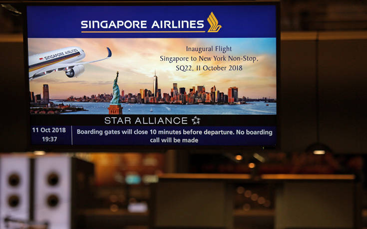 Το Airbus που πραγματοποίησε την πτήση Σιγκαπούρη-Νέα Υόρκη, τη μεγαλύτερη εμπορική αεροπορική διαδρομή στον κόσμο, έφθασε σήμερα στο αεροδρόμιο του Νιούαρκ, έπειτα από πτήση σχεδόν 18 ωρών, την πρώτη μετά την εγκατάλειψη αυτής της αεροπορικής σύνδεσης το 2013. Σύμφωνα με την ιστοσελίδα του αεροδρομίου του Νιούαρκ (Νιου Τζέρσεϊ), η πτήση SQ22 της Singapore Airlines έφθασε στις 05:29 τοπική ώρα (12:29 ώρα Ελλάδας), μετά την απογείωσή της στις 23:37 από τη Σιγκαπούρη, έπειτα από περίπου 17 ώρες και 52 λεπτά στον αέρα.