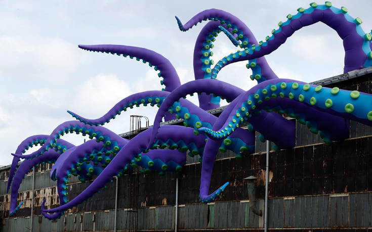 Είκοσι φουσκωτά πλοκάμια ξεπροβάλλουν από την οροφή και τα παράθυρα μιας διώροφης αποθήκης στη Navy Yard της Φιλαδέλφεια, στις ΗΠΑ. Λες και τέρατα της θάλασσας επιτέθηκαν σε αυτήν την πρώην αποθήκη στη ναυτική ζώνη της αμερικανικής μεγαλούπολης. Όπως αναφέρει το Αθηναϊκό Πρακτορείο Ειδήσεων, είναι η εγκατάσταση «Θαλάσσια Τέρατα ΕΔΩ», το μεγαλύτερο φουσκωτό «γλυπτό» που έχουν φιλοτεχνήσει έως σήμερα οι με έδρα τη Βρετανία Φίλθι Λάκερ (Filthy Luker) και Πέδρο Εστρέγιας (Pedro Estrellas). Το ολοκλήρωσαν σε συνεργασία με την τοπική κολλεκτίβα καλλιτεχνών Group X και τη Navy Yard που εκτείνεται κατά μήκος του ποταμού Ντελαγουέαρ.