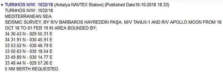 Η Τουρκία κλιμακώνει τις προκλήσεις της στη Μεσόγειο, καθώς από αύριο 18 Οκτωβρίου έχει εξαγγείλει πως θα στείλει το ερευνητικό σκάφος «Barbaros», συνοδευόμενο από το επίσης ερευνητικό «Apollo Moon» και το βοηθητικό «TANUX-1». Συγκεκριμένα, η Άγκυρα με την NAVTEX 1032/18 δεσμεύει περιοχή εντός της κυπριακής ΑΟΖ και κοντά στο όριο με το FIR Αθηνών για το χρονικό διάστημα από τις 18 Οκτωβρίου μέχρι την 1η Φεβρουαρίου.